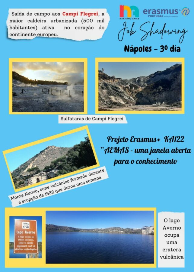 O terceiro dia de Job shadowing foi dedicado a uma saída de campo aos “Campi flegrei”, a área vulcânica ativa mais habitada da Europa (meio milhão de habitantes), o que a torna uma área de alto risco e, por isso, muito monitorizada. Trata-se de uma caldeira vulcânica com cerca de 200km 2 , localizada a 20km a oeste de Nápoles e do Vesúvio, onde se registam fenómenos de bradissismo, isto é, movimentos lentos de elevação do solo que alternam com movimentos de subsidência (desde 2005 registou-se um soerguimento médio de 152cm, dos quais 34cm nos últimos dois anos). Nesta área são frequentes as fumarolas e nascentes termais e é intensa a atividade sísmica de reduzida magnitude (por ex, em setembro deste ano foram registados 423 sismos).