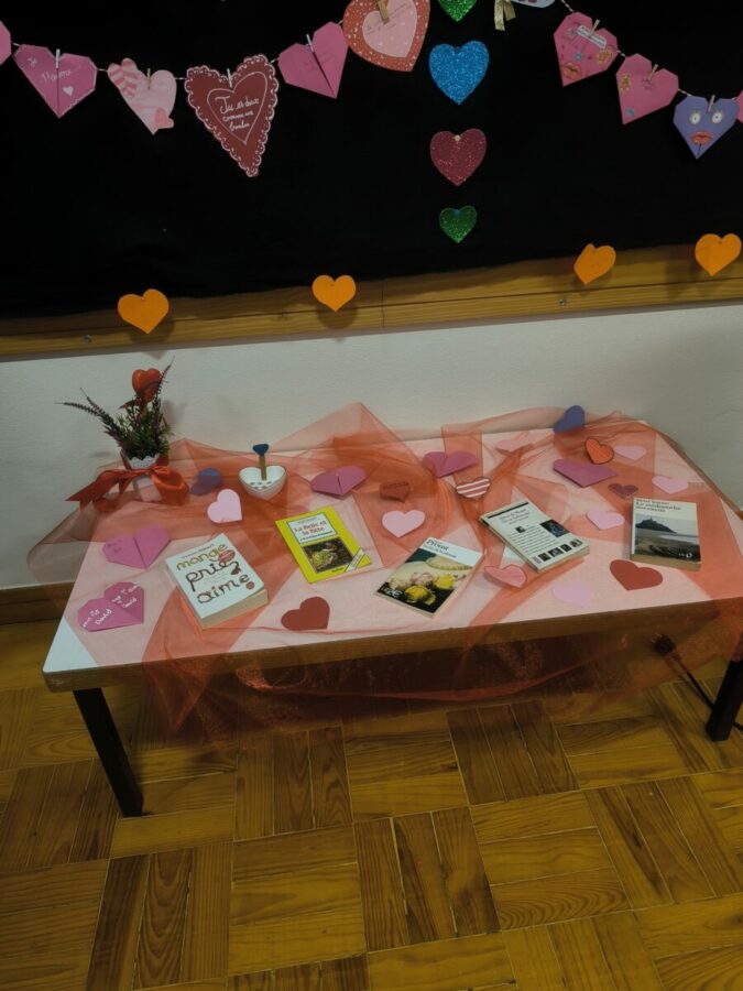 Imbuídos destes sentimentos e com muita habilidade, os alunos das diversas turmas do 3º Ciclo elaboraram corações de várias formas, materiais e tamanhos, com mensagens de conforto e de amizade, escritas em Francês. Assim, entre os dias 12 e 27 de fevereiro, quem entrou na Biblioteca da Escola Martinho Árias foi surpreendido com uma exposição simbólica, onde se podiam ler mensagens como: “Le monde peut changer, mais je serai toujours ton ami (e )”, “Voici un coeur pour toi, tu es un( e ) ami(e) formidable”, “ Je suis heureux(se) d’être ton ami( e )”, “Tu es doux(ce) comme un bonbon”, “ Tu es beau (belle) comme une fleur”. Neste contexto foram seleccionados e estiveram em destaque alguns livros de autores franceses ligados à mesma temática.