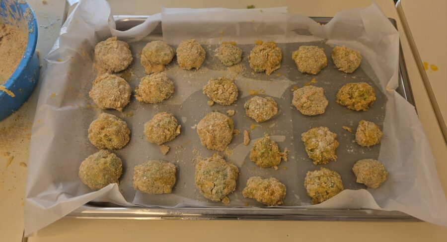 De seguida, dinamizou uma atividade prática em que, juntamente com as crianças, confecionou nuggets de frango com brócolos e cenoura. Durante a preparação, explicou cada etapa do processo de forma clara e acessível, incentivando a participação ativa das crianças. Estas tiveram a oportunidade de colaborar na confeção, ajudando a modelar os nuggets, que posteriormente foram levados ao forno.